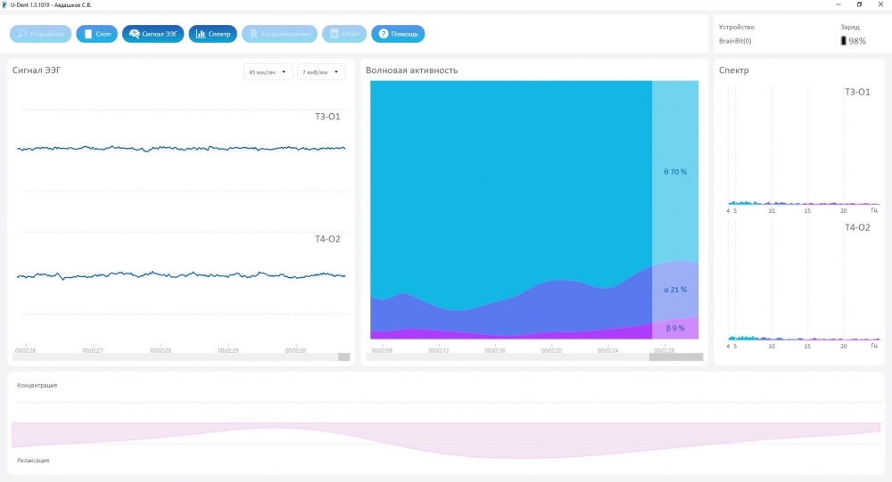 - Отображение спектра сигнала альфа-, бета- и тета-ритмов.