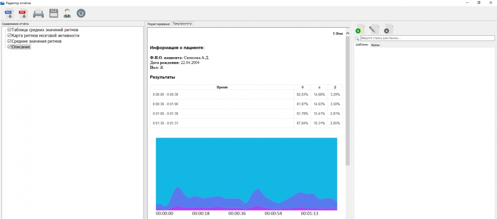 - Демонстрация изменений волновой активности во времени на основании алгоритма анализа оценки состояний по альфа-, бета- и тета-ритмам.