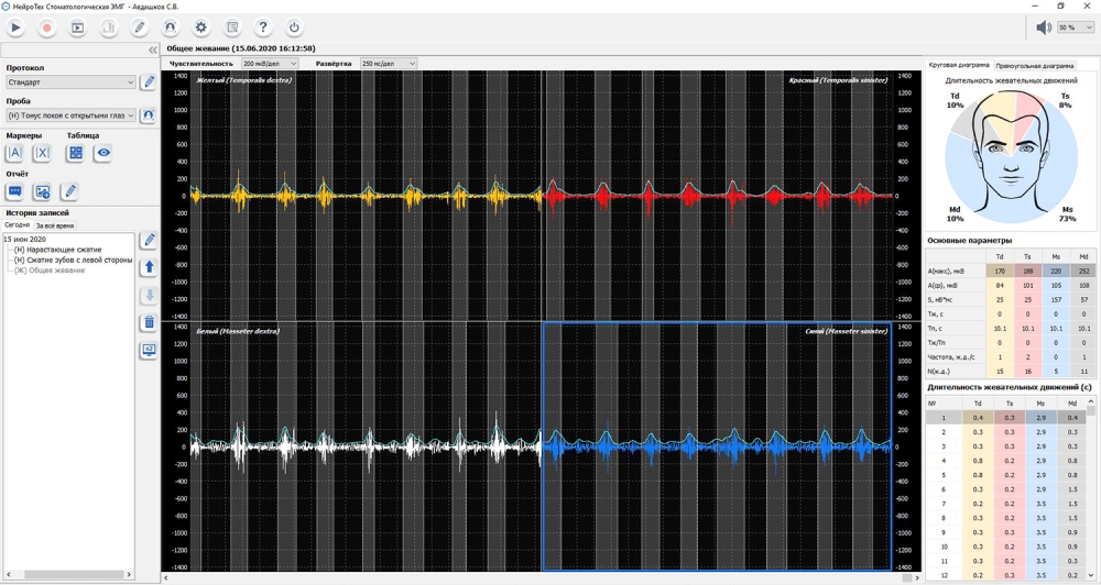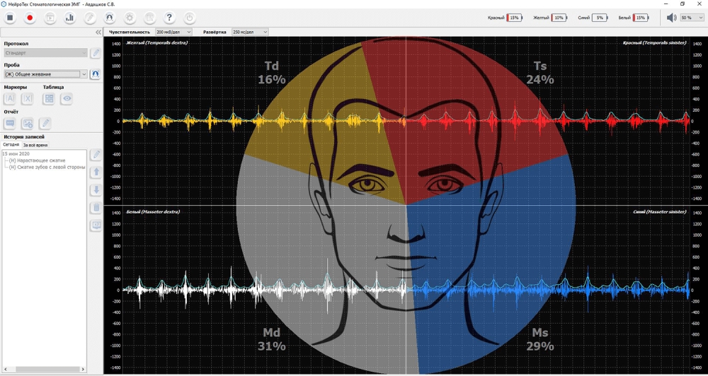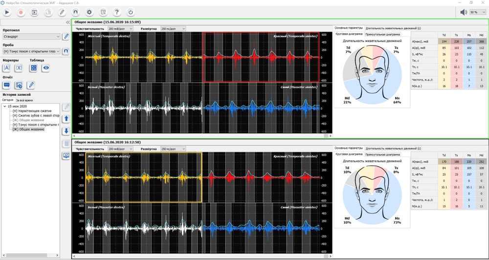 Применяется система «Колибри» как средство регистрации активности лицевых мышц с целью оценки реципрокной регуляции и функционального взаимоотношения симметричных мышц антагонистов, агонистов и синергистов в процессе жевания и движений нижней челюсти.