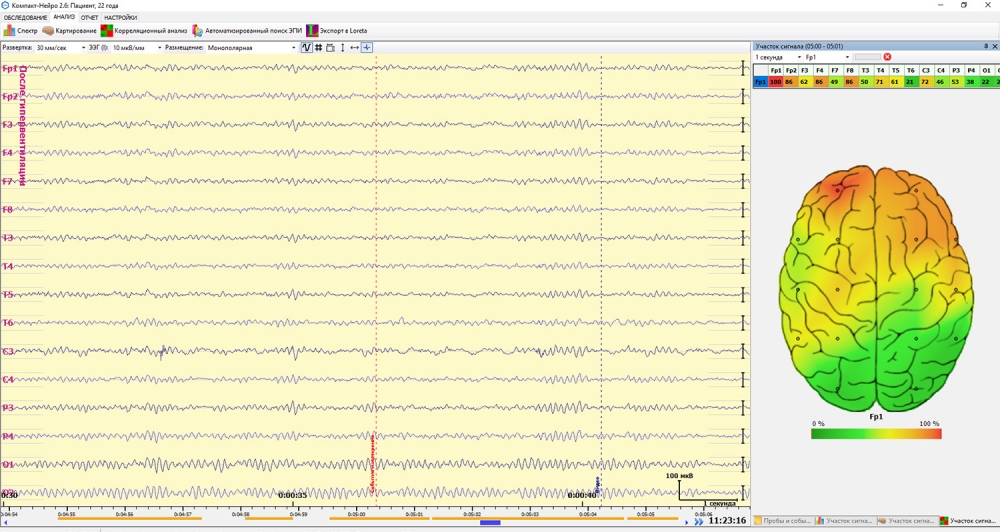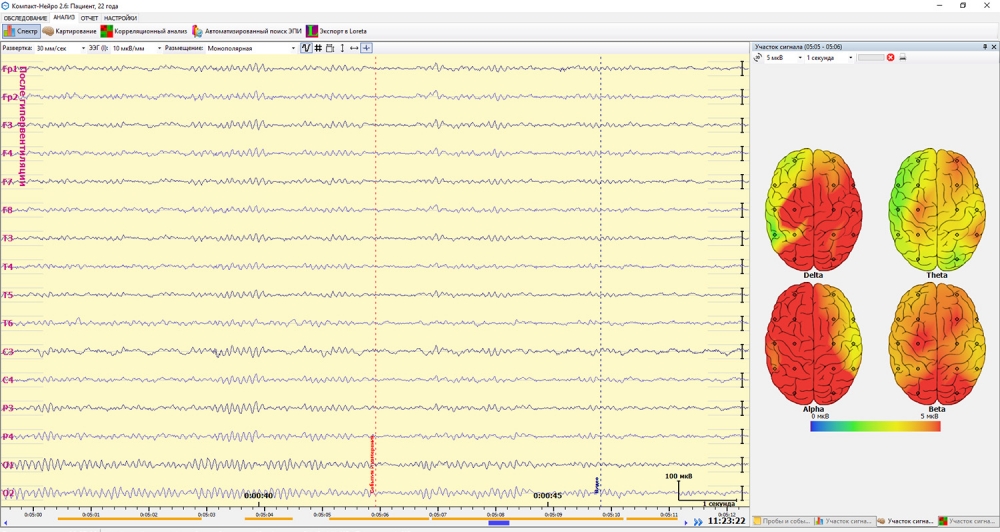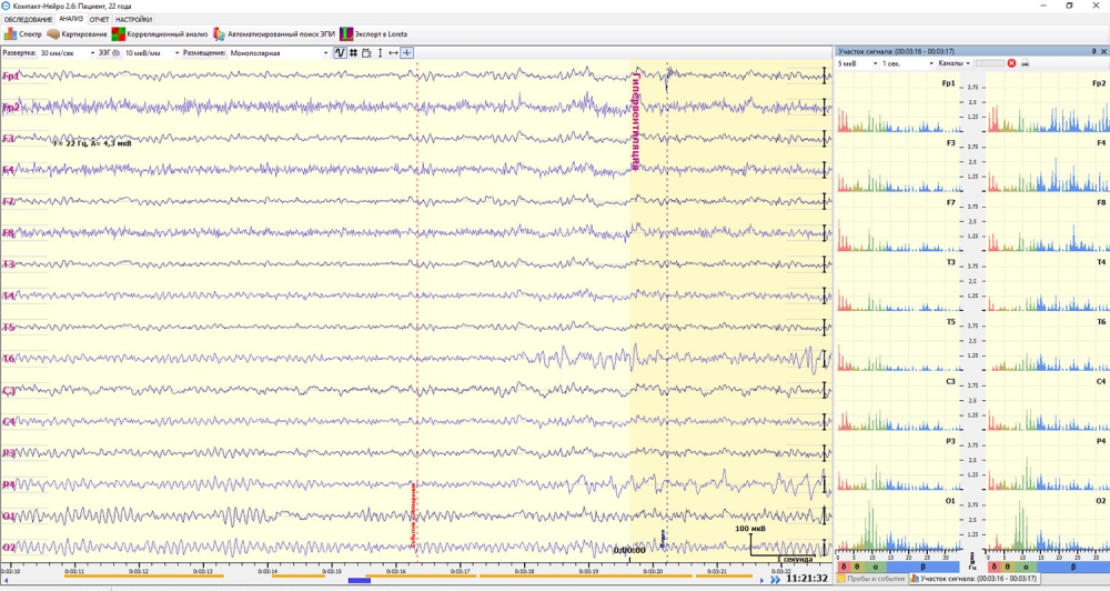 В реальном времени и после регистрации доступны функции анализа ЭЭГ:
