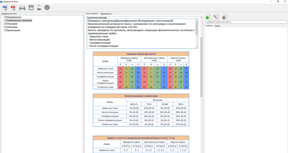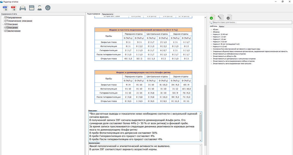- расчеты межполушарной асимметрии, индекса и частоты ритмов.