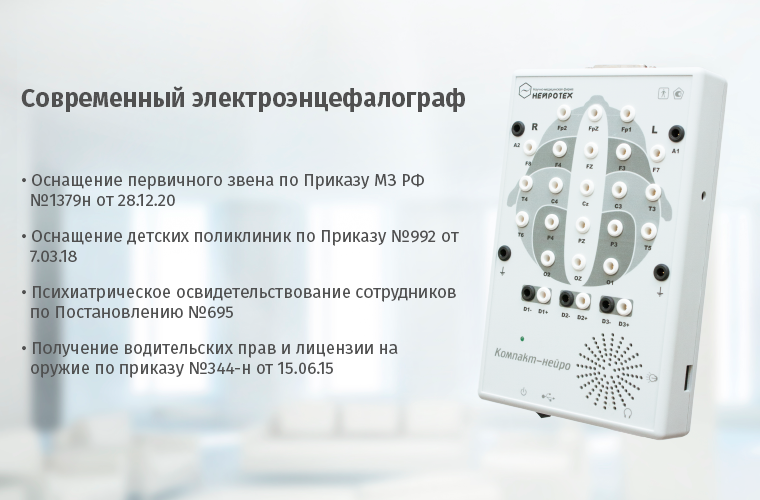 2. Система «Компакт-Нейро» 21 канал соответствует Перечню оборудования для оснащения и переоснащения медицинских организаций по Приказу МЗ РФ №1379н от 28.12.2020 г. (код вида мед. изделия 291870 «Система электроэнцефалографического мониторинга, стационарная»)